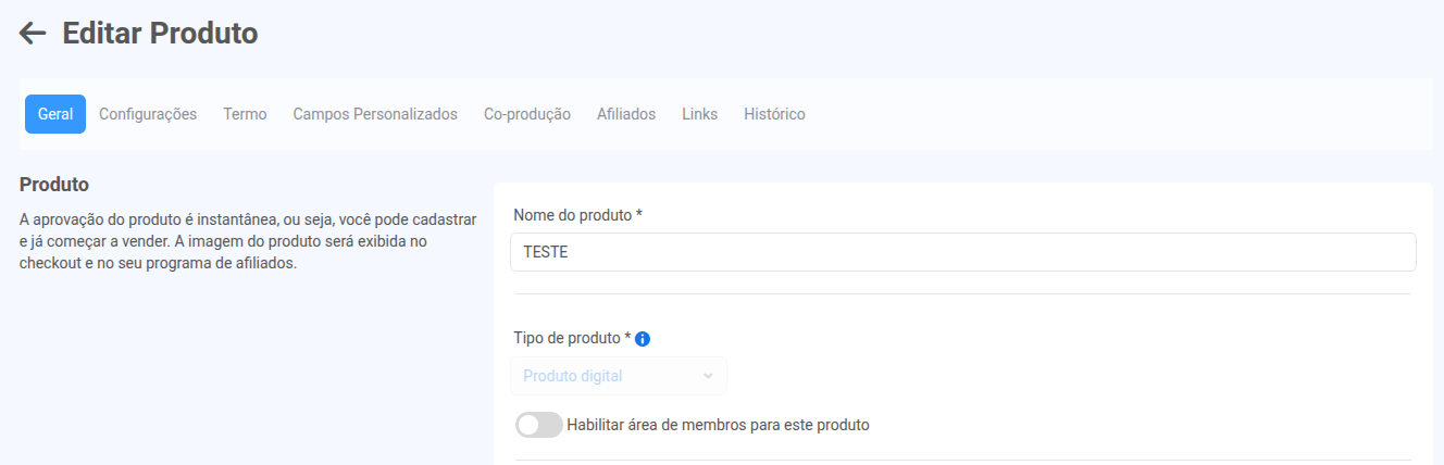 Ative o toggle “Habilitar área de membros para este produto”.