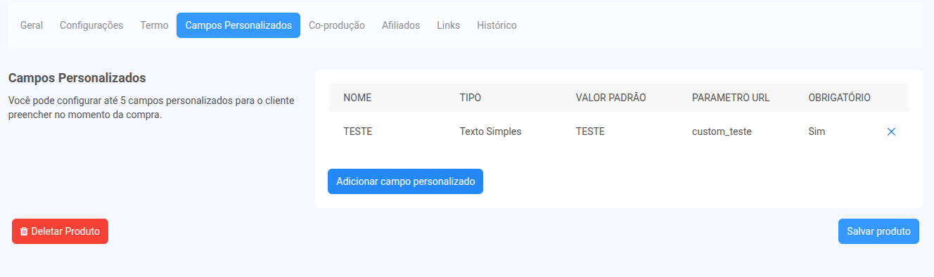 Os campos personalizados permitem que você colete informações específicas dos clientes no momento da compra. É possível configurar até 5 campos personalizados por produto, tornando o processo de checkout mais adaptado às suas necessidades.