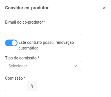 Informe o e-mail usado pelo co-produtor na plataforma. Ele receberá um convite para aceitar a parceria. O convite só é válido se o e-mail estiver vinculado a uma conta ativa.