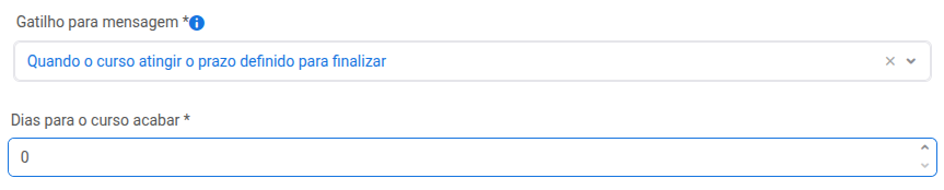 Se selecionar 'Quando o curso atingir o prazo definido para finalizar' aparecerá o campo 'Dias para o curso acabar *' – informe quantos dias antes do fim a mensagem será enviada