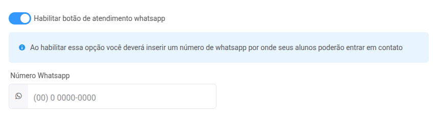 Ao habilitar essa opção você deverá inserir um número de whatsapp por onde seus alunos poderão entrar em contato