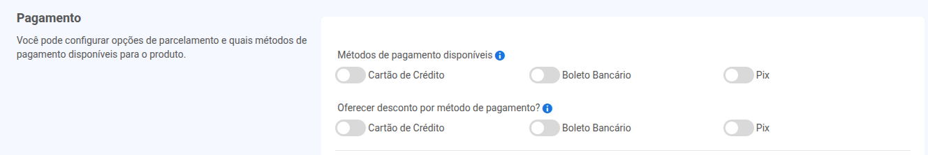 Nesta seção, você poderá ativar ou desativar os seguintes métodos de pagamento:
