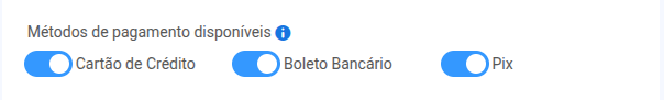 Ao ativar, serão exibidas opções de configuração para Cartão de Crédito, Boleto Bancário e Pix.