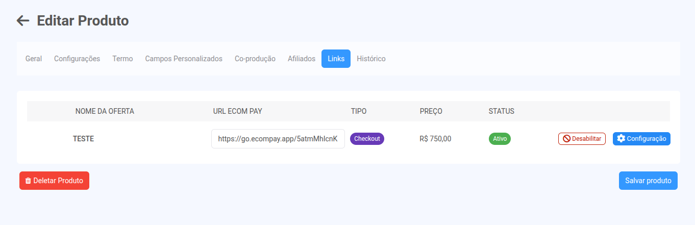 Quando desabilitado, o link deixa de funcionar e direciona para uma página de "Não encontrada". Ideal para pausar ou encerrar uma oferta sem apagar o produto.