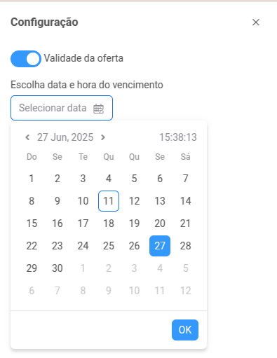 Quando ativado, aparece o campo para escolher uma data e hora de vencimento da oferta.