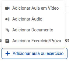 Selecione: Adicionar Aula em Vídeo, Adicionar Áudio, Adicionar Documento ou Adicionar Exercício/Prova.