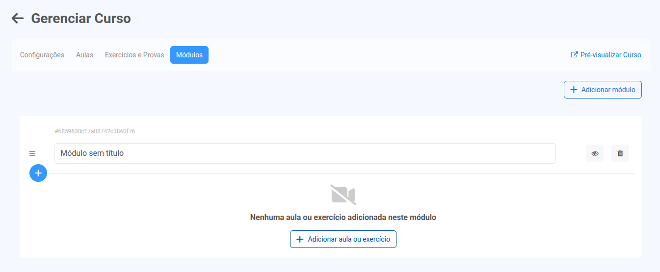 Logo abaixo do nome do módulo, será exibida a mensagem Nenhuma aula ou exercício adicionado a esse módulo, até que você associe conteúdos a ele.