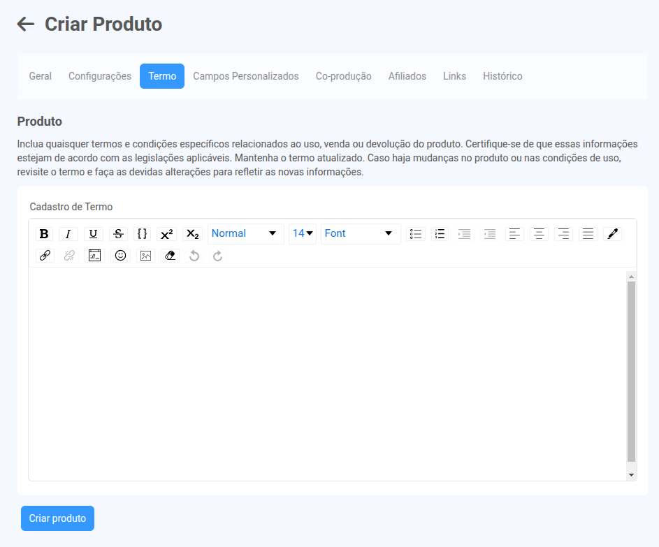 A aba “Termo do Produto” permite que você inclua termos e condições específicos relacionados à compra, uso, entrega ou reembolso do seu produto. Esse conteúdo fica visível no momento da compra e é fundamental para garantir transparência, proteger você legalmente e alinhar expectativas com o cliente.